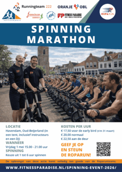 Op vrijdag 1 mei organiseren wij vanuit Fitness Paradise samen met 4 Roparun teams een leuk spinning event in het centrum van Oud-Beijerland. De opbrengst van deze actie komt volledig ten goede van de Roparun teams.